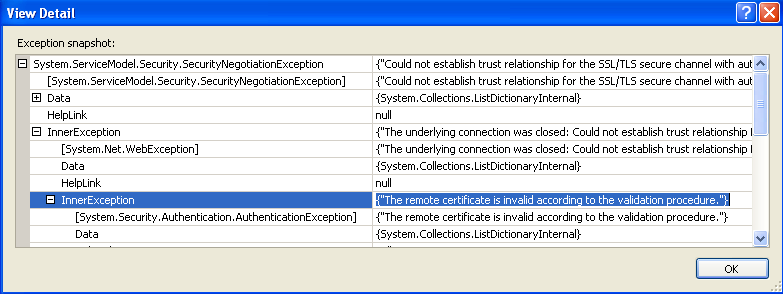 Now what? Ifyou click on View Details… under Actions: Go to InnerException and go to InnerException of this InnerExcepiton.You will see a message that says “Theremote certificate is invalid according to the validation procedures” asshown in the following picture.